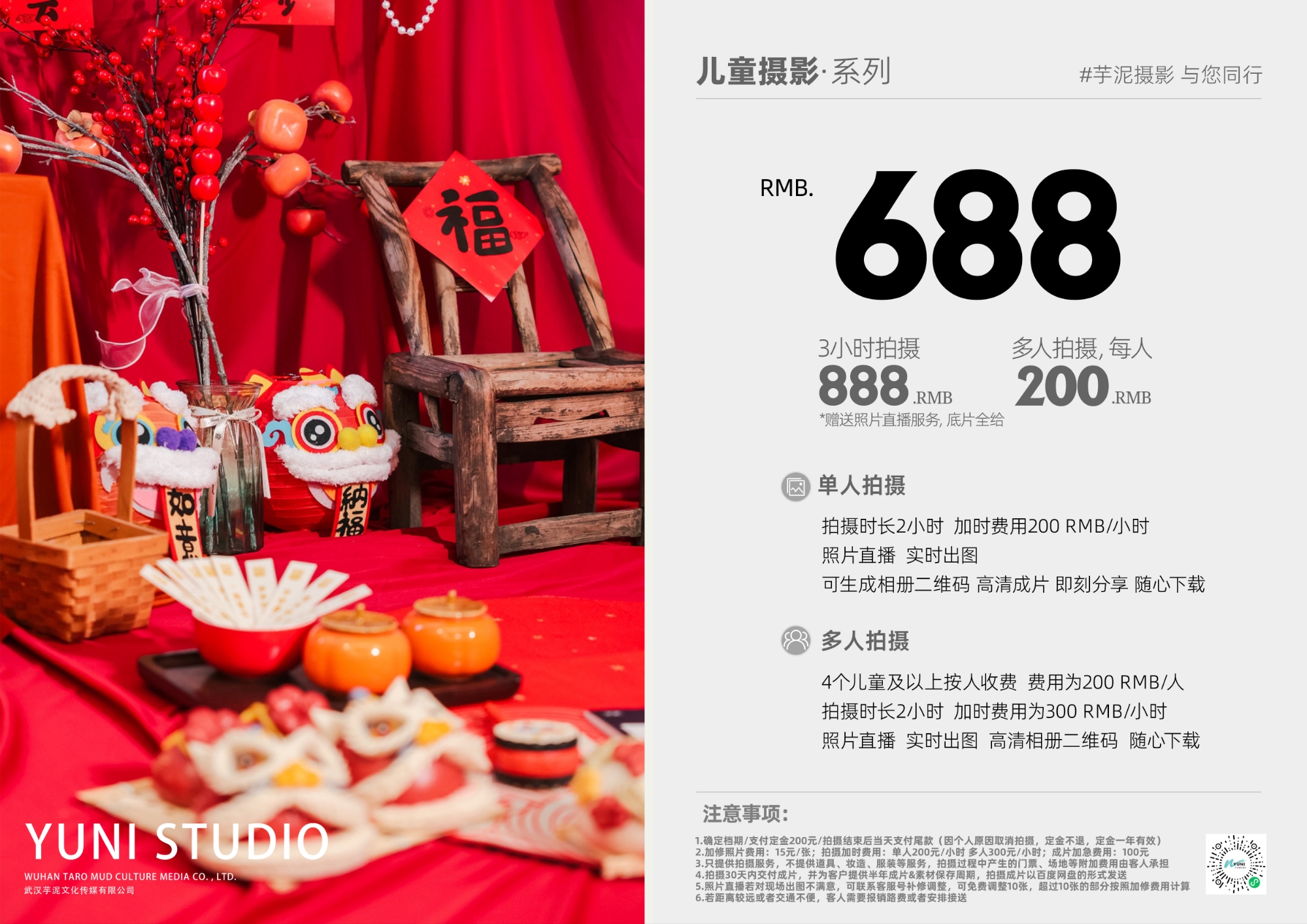 (4)摄影团队只提供拍摄服务,不提供道具、妆造、服装等,如有需要,可以提供咨询和介绍,咨询和介绍的内容、团队、商家等仅供参考;